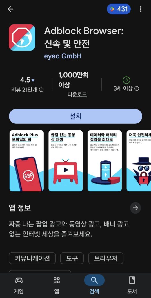 - Adblock Browser: 설치 후 바로 광고 차단된 환경에서 웹 서핑 가능
