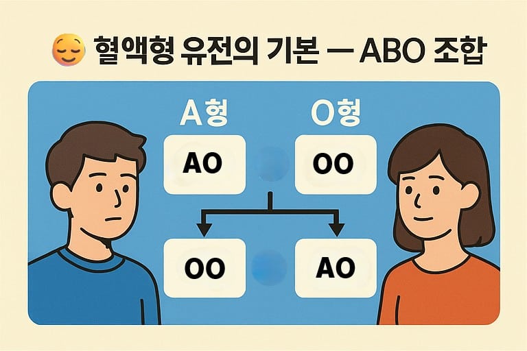 예를 들어, 아버지가 A형(AO), 어머니가 O형(OO)이라면 → 아이는 A형(AO) 혹은 O형(OO)이 돼요.