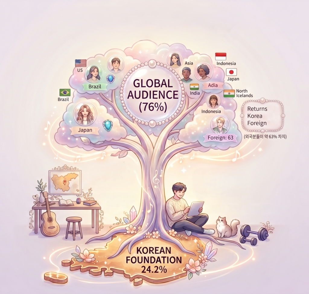 - Kekuatan Global (76,2%): Tingkat kunjungan kembali yang tinggi ini tidak hanya terjadi di antara penggemar Korea, tetapi fakta bahwa hal ini terjadi di antara 76% orang asing di seluruh dunia adalah poin yang sangat mengesankan. Orang asing yang tidak mengerti satu kata pun bahasa Korea datang kembali lebih dari 50% hanya karena merasakan emosi dari konten Seojun? Ini adalah data yang sangat langka di genre apa pun. 🌍✨